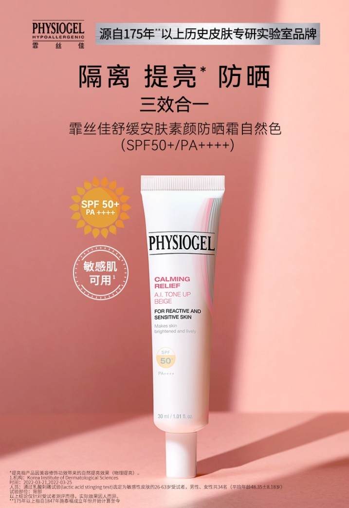 [2025 年 3月 27 日,上海] 快节奏繁忙生活之中,“自然妆感”、“精简主义”盛行,消费者更加追求既能充分保护肌肤,同时不失自然美感的多效护肤方式。这一趋势下,国际干敏专研品牌霏丝佳PHYSIOGEL推出全新舒缓安肤素颜防晒霜自然色(简称:霏丝佳素颜防晒霜),带来轻松、便捷的护肤方案,隔离、提亮、防晒三效合一,拓展传统防晒边界,一抹绽放肌肤光采。这款干敏肌友好的SPF50+/PA++++高倍防晒霜,遮挡紫外线的同时,以霏丝佳核心拟肤成分温和舒缓修护。轻薄服帖质地可替代隔离霜与粉底液,自然提亮,打造快速出门"伪素颜"。同时,新品将在山姆全国门店同步上市,为门店会员提供春夏防晒的崭新选择。
