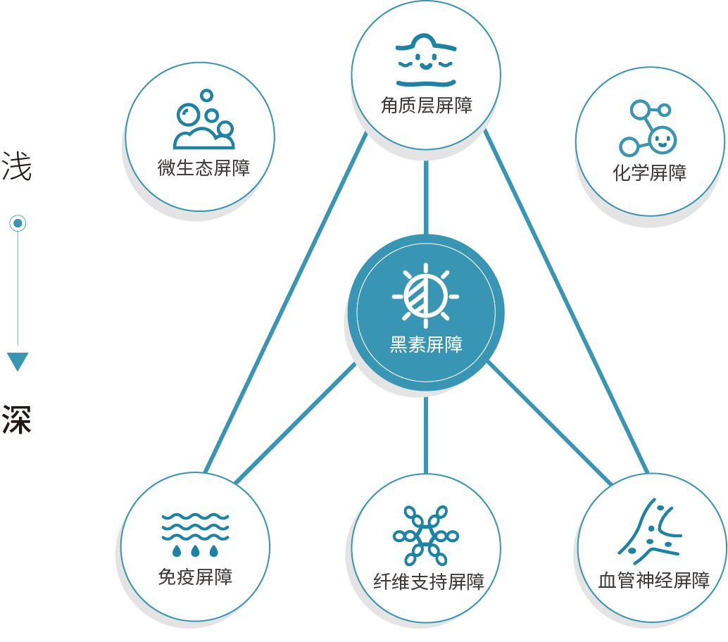 彼时大量的研究也都集中在角质层,后来才逐渐发皮肤屏障受损不仅仅是角质层的问题,皮肤外面实际上有一个微生态屏障,生态受损,皮肤状况就会受到影响。当仔细地把皮肤各大胜利功能结构进行归类总结,就发现实际上由7个屏障来组成了皮肤的完整结构组织,它们代表不同维度,皮肤全屏障修护也就是从浅到深一体化、系统地考虑皮肤修护,这样才能真正修护皮肤屏障。