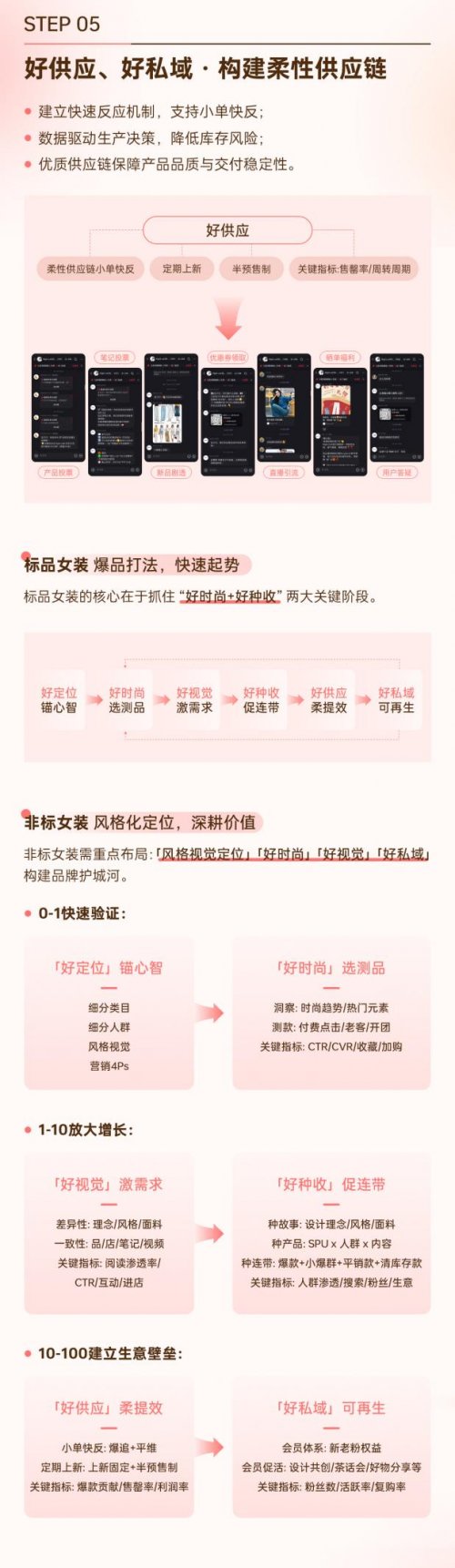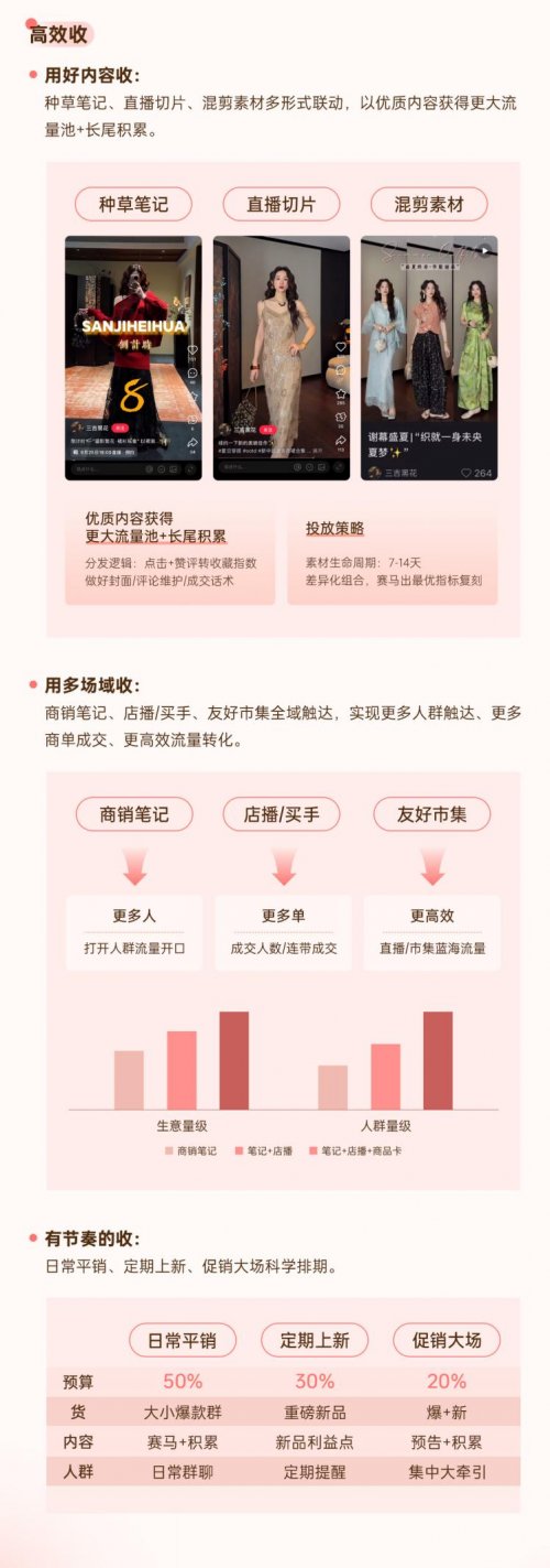 然而,女装商家仍面临“人货场”三重挑战。对此,小红书提出 「女装经营六部曲」——好定位、好时尚、好视觉、好种收、好供应、好私域,系统化解经营难题,实现可持续增长。