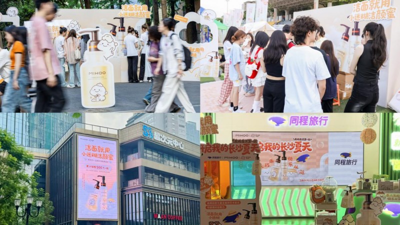 本次联名,MIHOO小迷糊携手美丽修行在湖南多所高校打造“乖巧洗脸派样站”,将乖巧宝宝表情包经典元素融入线下体验,多种互动装置展示,两校活动日均人流量超4000人次,现场反响热烈;在线下传播层面,MIHOO小迷糊采取分圈层精准投放策略:在广州、重庆、杭州中心地段,上屏多块电子大屏,单日共触达6千万人次,线上发起“打卡偶遇小迷糊”的活动,反响热烈,参与人次超1000。此外,与同程旅行携手在长沙南站打造高铁站主题店,通过主题陈列、定制版长沙夏天心情拍照墙等装置,日均吸引3000+旅客互动,同程旅行APP上线:“开启我的长沙夏天”活动,实现旅行场景和联产品属性强结合。