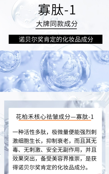 寡肽-1是一种活性多肽,极微量便能强烈刺激细胞生长,抑制衰老,而且其无毒、无刺激、安全无副作用,并且效果突出,备受美容界推崇,是获得诺贝尔奖肯定的化妆品成分。