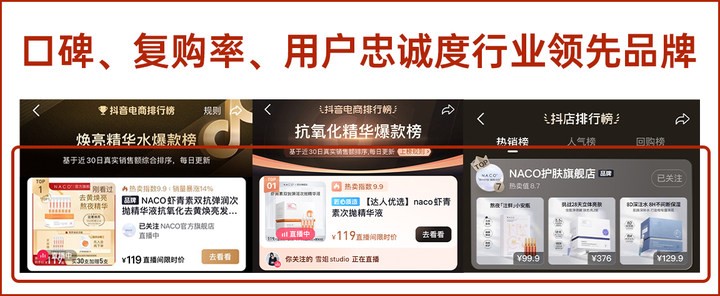 4年间,NACO秉承精益求精的匠心精神,精研细磨升级虾青素精华液配方、功效和极致体验感,从初代虾青素原液、1.0虾青素橘灿精华液,到2.0虾青素双抗次抛精华,帮百万用户解决暗黄垮脸的肌肤问题,持续4年斩获多平台虾青素“爆款榜”TOP1的傲人成绩。2018年初代虾青素上市,月销突破1262w支,2019年NACO虾青素、烟酰胺冲TOP1,全渠道月销超过3062w支,到2021年虾青素霸榜抖音,单品月销2600w支。2022年虾青素破圈升级,全新配方&次抛包装功效翻倍,霸榜抖音抗氧榜单销量NO.1。