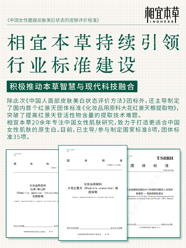 值得一提的是,多年来,相宜本草不仅在本草护肤领域取得了丰硕的成果,也一直积极参与化妆品行业的标准化建设,为推动行业的标准化、规范化发展贡献自己的力量。3月13日,由相宜本草参与制定的《中国人面部皮肤美白状态评价方法》团体标准正式发布。此标准的发布,标志着中国女性在美白护肤领域有了可量化、可追溯的美白效果验证方案,它的应用也将填补国内皮肤美白评价领域量化标准的空白,为化妆品研发、临床检测及个人护肤提供科学依据,助力健康美学理念的推广与实践。