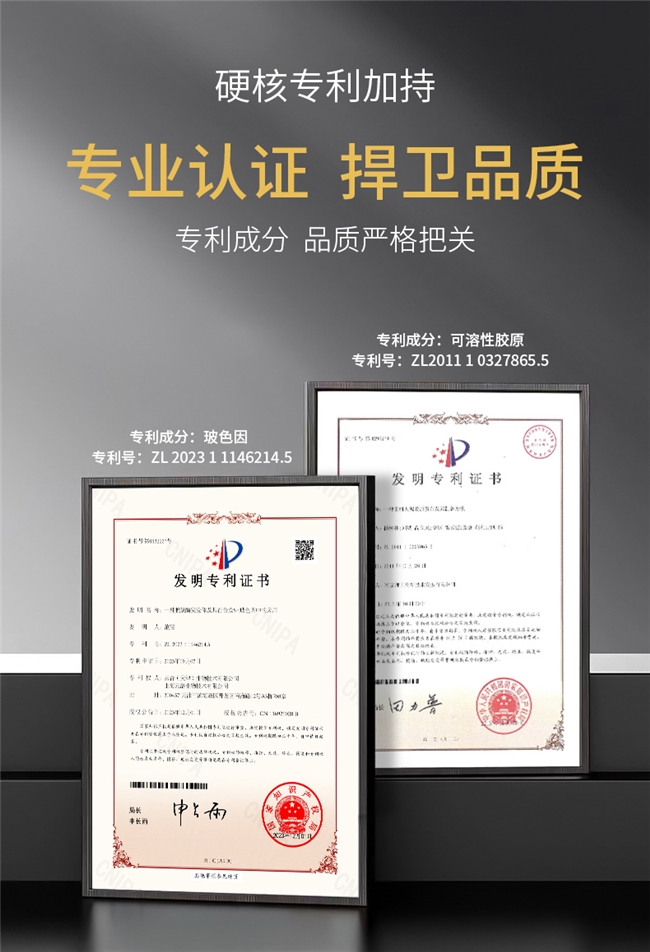 中国发明专利(专利号:ZL 201110327865.5):另一个专利成分是可溶性胶原。它就像给皮肤直接递上一把“填充材料”,让那些流失掉的饱满感有机会一点一点补回来。一个是负责把松弛的结构收紧,一个是负责把空缺的地方填实,一个收紧一个填充,紧致感自然水到渠成。